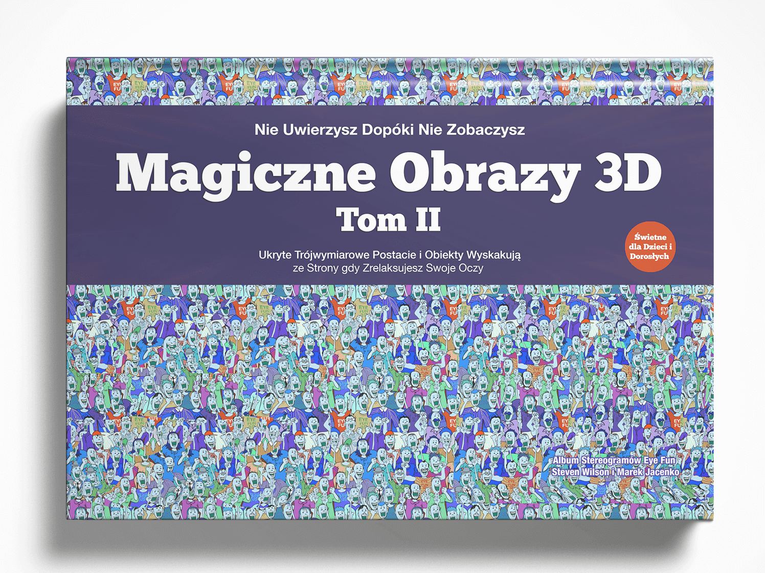 Po prostu weź zamkniętą książkę do ręki. Patrząc na obrazek na pierwszej stronie okładki rozluźnij oczy, rozmyj wzrok, poczekaj, zobaczysz ukryty obraz 3D. (Na stronie 4 opisane są dokładniej trzy metody na zobaczenie obrazów.)